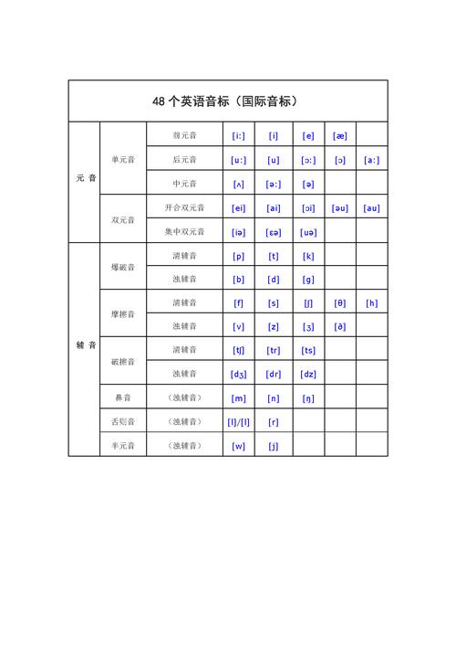 以下是关于“国际音标表Word表格免费”的简介: 国际音标表(IPA)是语言学习与研究的重要工具,用于准确标注语音发音。现提供免费下载的Word格式音标表格,包含完整元音、辅音及附加符号,排版清晰,可直接编辑或打印。该表格适合英语教师、学生及语言爱好者使用,方便插入课件、笔记或教材中,无需自行绘制,节省时间且实用性强。免费资源可通过教育类网站或论坛获取,助力高效学习与教学。
