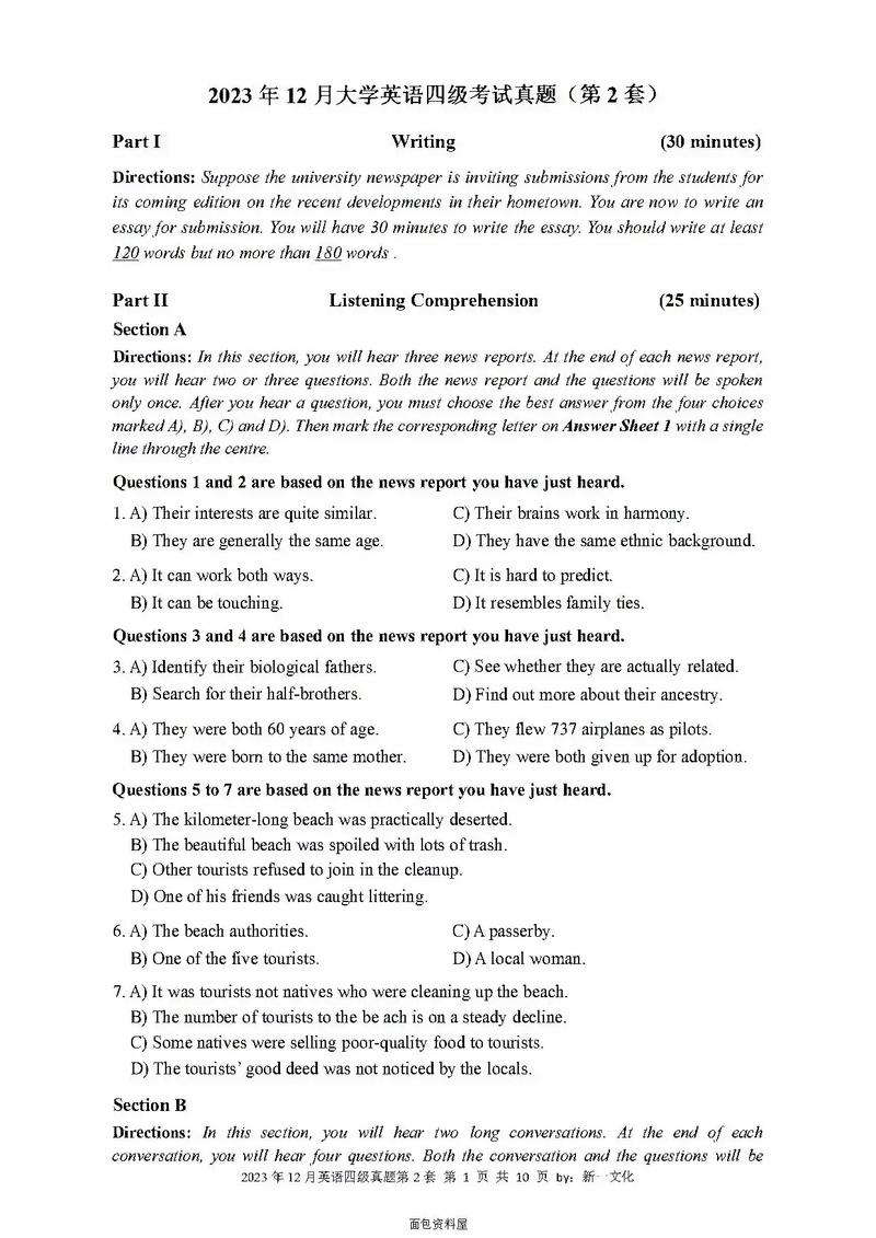 "四级真题PDF"是专为备考大学英语四级考试(CET-4)的学习者整理的电子版真题资源,包含历年考试听力、阅读、写作与翻译等完整题型。这些PDF文件通常按年份分类,附带答案和听力音频,帮助考生熟悉考试难度、题型分布及命题趋势。通过真题训练,学生可针对性提升答题技巧,掌握高频词汇和语法考点。部分资源还提供解析或笔记标注,适合自主刷题与错题复盘。电子版便于随时查阅和打印,是高效备考的重要工具。建议结合计时练习,模拟真实考场环境。